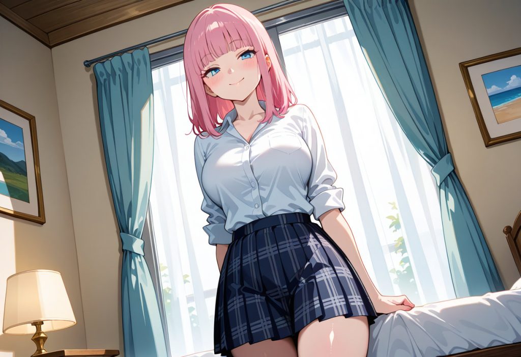 hotpink hair,medium hair,hime cut,standard height,medium-large breasts,(fair skin:1.6),brown eyes,gyaru,20 years old